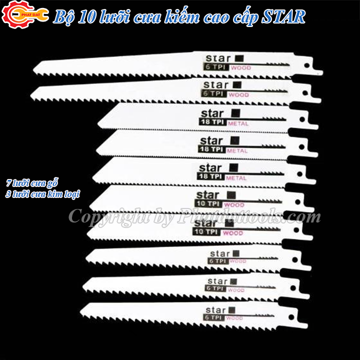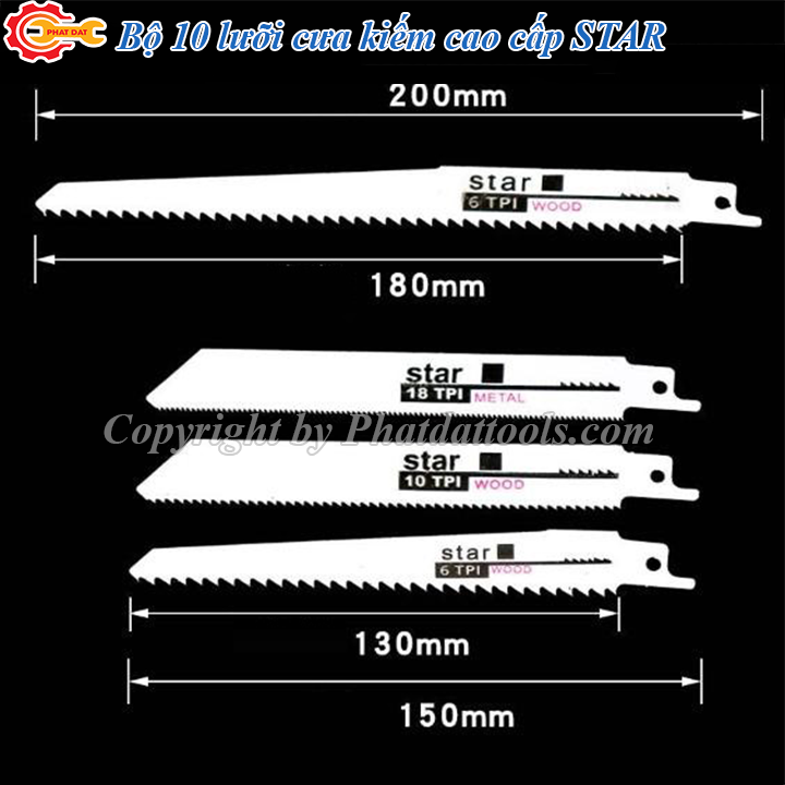 Bộ 10 lưỡi cưa gỗ-kim loại cho máy cưa kiếm bao gồm 2 lưỡi cưa gỗ dài 200mm 6TPI,3 lưỡi cưa kim loại dài 150mm 18 TPI,2 lưỡi cưa gỗ 10TPT,3 lưỡi 6TPT dài 150mm.TPI là đơn vị chỉ số răng cưa trên 1 inch dài.Tùy thuộc vào những vật liệu khác nhau mà chúng ta lựa chọn loại lưỡi cho phù hợp.