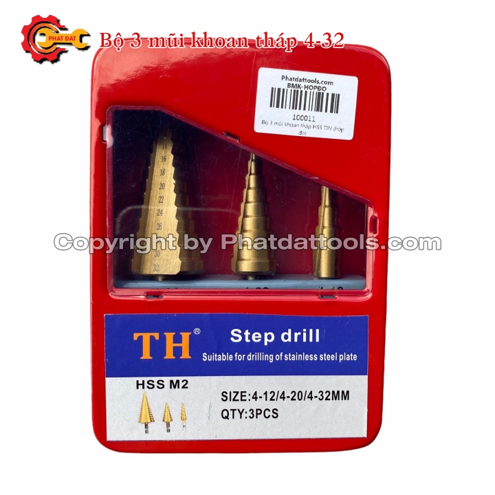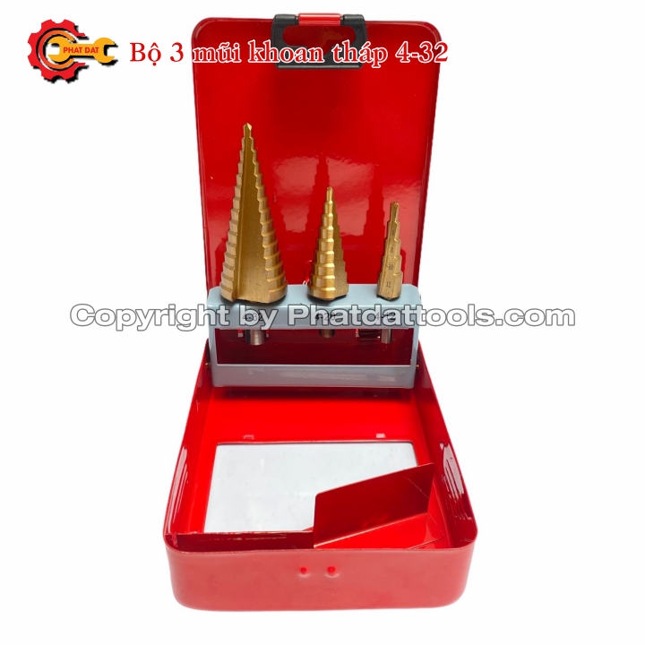 Bộ 3 Mũi Khoan Tháp HSS Phủ TIN gồm 3 mũi :4-12,4-20 và 4-32,với nhiều cấp đường kính khác nhau trên một mũi khoan,bạn có thể khoan tạo lỗ, khoan doa với đường kính thay đổi từ 4mm đến 32mm mà không phải thay mũi khoan như các loại mũi khoan thông thường.