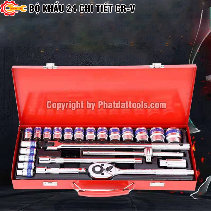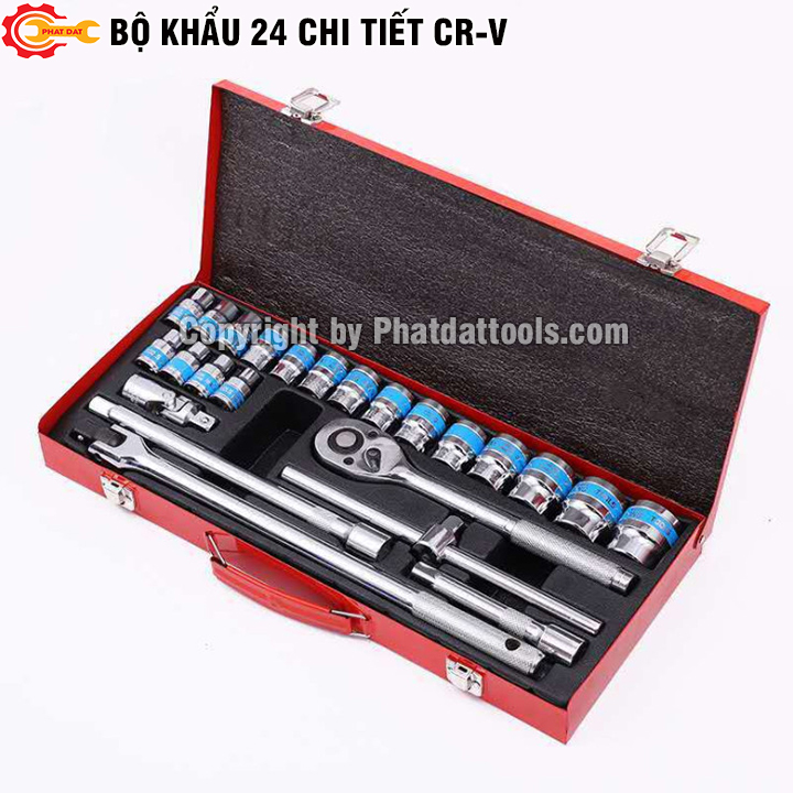 Bộ Khẩu 24 Chi Tiết Mạ CR-V Không Gỉ là bộ dụng cụ sửa chữa tuyệt vời với khả năng tháo mở được hầu hết các loại bulong,ốc vít thông dụng,tay cầm chắc chắn được bọc cao su mềm nên rất êm tay giúp người thợ không thấy mỏi ,đau tay khi siết mạnh,đặc biệt lớp cao su mềm chống bám dầu mỡ.