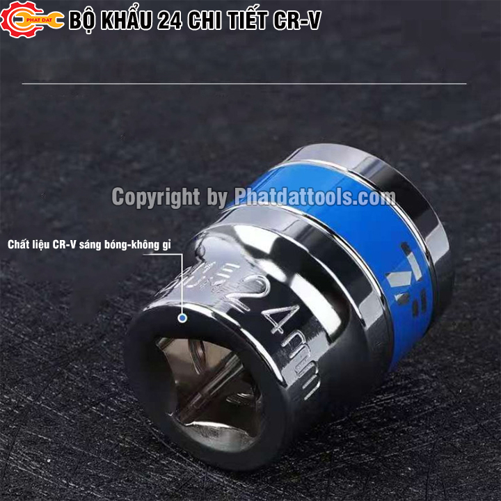 Bộ Khẩu 24 Chi Tiết Mạ CR-V Không Gỉ của hãng sản xuất Đài Loan đạt tiêu chuẩn chất lượng Đức và được nhập khẩu và phân phối vào Châu Âu với các chi tiết được gia công tỉ mỉ,chính xác,chất liệu thép Chrome Vanadium sáng bóng siêu bền,không gỉ,cho độ cứng và độ đàn hồi tốt giúp cho các chi tiết trong bộ khẩu không bị hư hại và mài mòn trong quá trình sử dụng