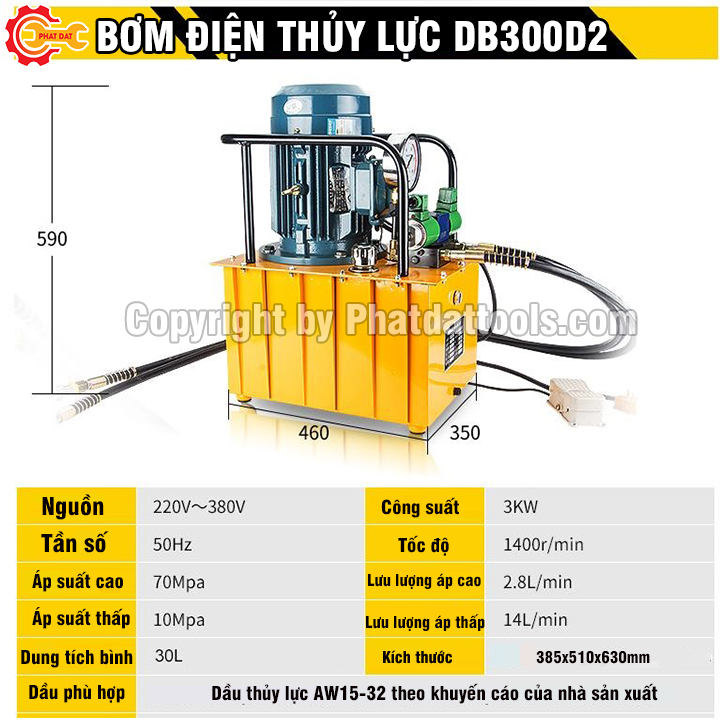 Bơm Điện Thủy Lực DB300D2 hay còn gọi là bộ nguồn thủy lực,trạm nguồn thủy lực,là một thiết bị bơm đẩy dầu thủy lực với áp suất lớn đến các thiết bị thủy lực như kích thủy lực,máy đột lỗ ,cắt,uốn,ép cos...