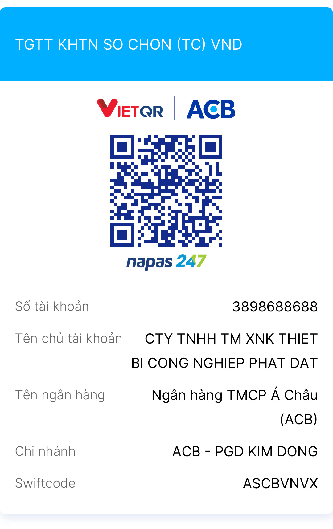 Số tài khoản: 3898688688 Tên chủ tài khoản: CTY TNHH TM XNK THIET BI CONG NGHIEP PHAT DAT Tên ngân hàng: Ngân hàng TMCP Á Châu (ACB) Chi nhánh: ACB - PGD KIM DONG Swiftcode: ASCBVNVX