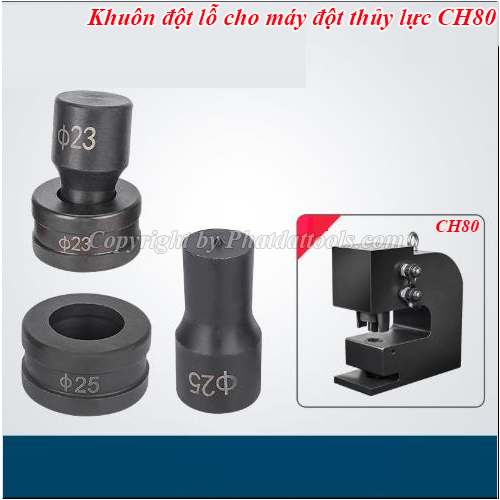Khuôn đột lỗ tròn cho máy đột lỗ thủy lực CH80 là phụ kiện tiêu hao,chế tạo bằng thép hợp kim được tôi thẩm thấu cho độ cứng lớn,độ bền cao,tuổi thọ trung bình từ 1500-2500 lần đột tùy vật liệu và phải đúng yêu cầu kĩ thuật,khi lắp đặt khuôn vào máy phải đảm bảo độ chính xác,siết chặt và căn chỉnh cẩn thận trước khi vận hành,nếu sai thì chỉ 1 lần đột có thể gây cong vẹo chày,vỡ cối...