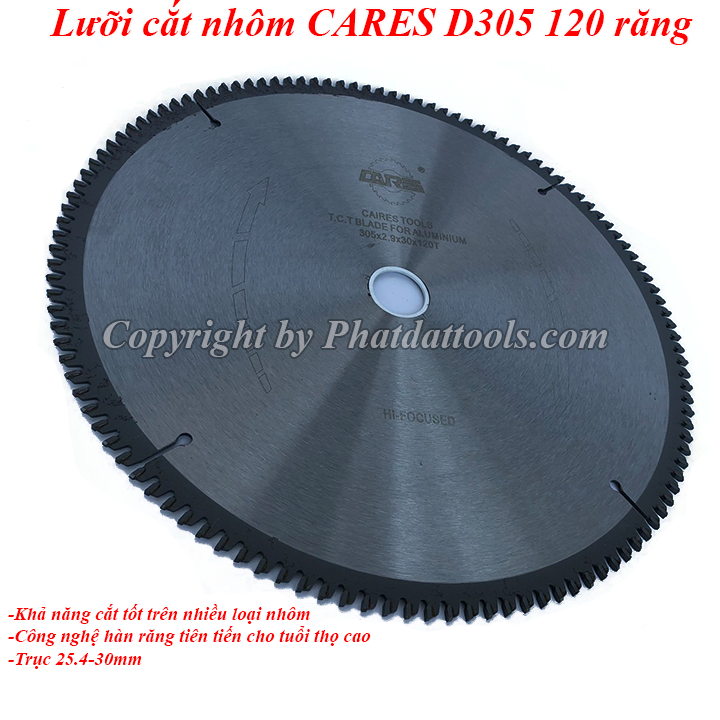 Lưỡi cắt nhôm CARES D305 120 răng có trục cốt 30mm chuyển về được 25.4mm bằng long den đi kèm giúp phù hợp với cả dòng máy cắt lớn,máy cắt 2 đầu cũng như máy bàn thông thường.
