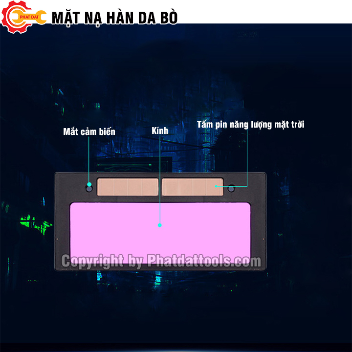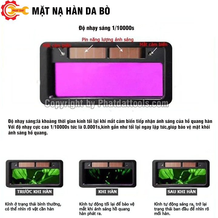 Mặt Nạ Hàn Điện Tử Da Bò tạo ra sự bảo vệ gần như tuyệt đối cho mắt và da mặt, sử dụng công nghệ năng lượng vĩnh cửu,lấy năng lượng ánh sáng mặt trời hoặc năng lượng từ chính ánh sáng hồ quang hàn.Chất liệu da bò thật giúp tăng độ bền,chịu nhiệt tốt.Mặt nạ có thể tháo rời thành kính hàn khi cần thiết.
