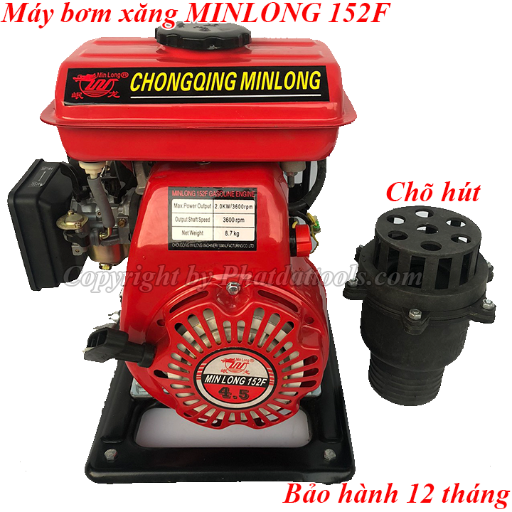 Máy bơm xăng MINLONG 152F là dòng máy bơm xăng phổ biến trong tưới tiêu nông nghiệp,máy có thiết kế nhỏ gọn,dễ dàng di chuyển,vận hành êm,tiêu thụ nhiên liệu thấp.Do không dùng điện nên máy có độ an toàn cao,tầm hoạt động rộng.