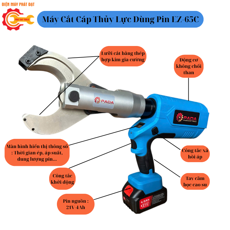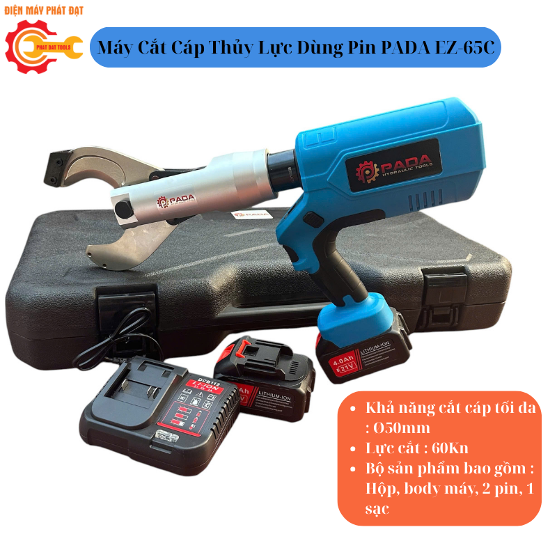 Máy Cắt Cáp Thủy Lực Dùng Pin PADA EZ-65C là thiết bị chuyên dụng được thiết kế để cắt các loại cáp đồng, nhôm, cáp bọc thép một cách dễ dàng và nhanh chóng. Với thiết kế hiện đại, sử dụng pin sạc tiện lợi, EZ-65C là giải pháp lý tưởng cho các công trình điện lực, viễn thông, cơ khí và công nghiệp xây lắp.
