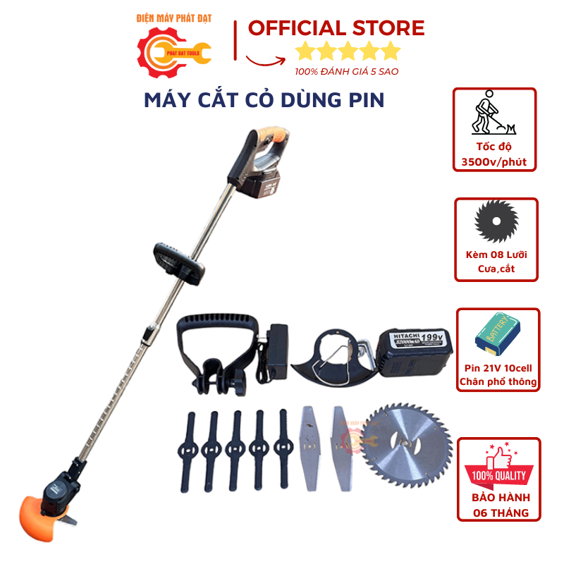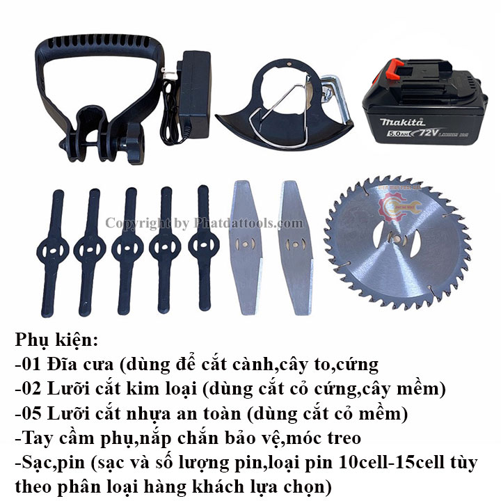 Phụ kiện đi kèm :Máy,02 pin 10 cell hoặc 15 cell (tùy theo option quý khách lựa chọn),sạc,05 lưỡi cắt nhựa,02 lưỡi cắt kim loại,01 đĩa cưa,tay cầm phụ,dụng cụ tháo lắp lưỡi...