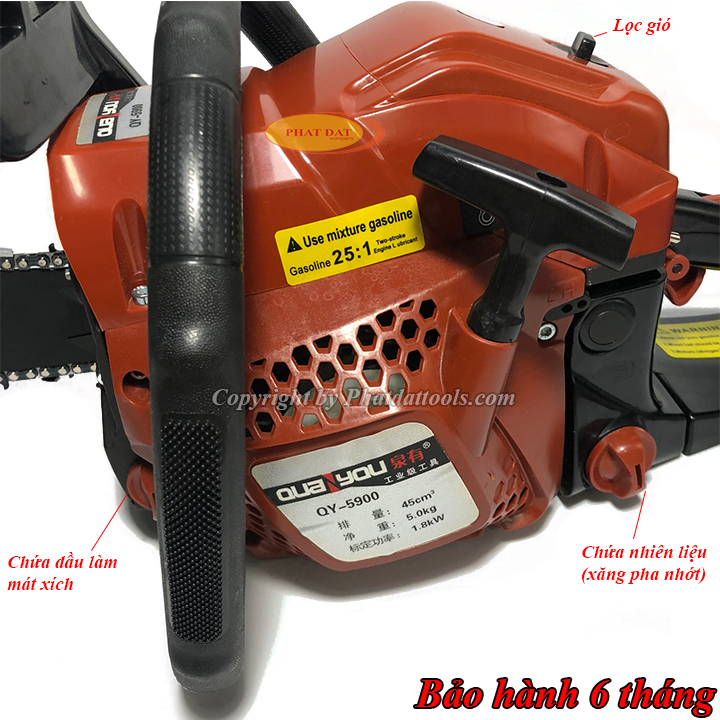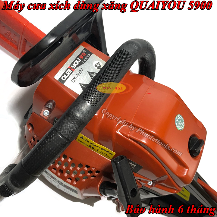 Máy cưa xích xăng QUANYOU QY 5900 sản xuất từ chất liệu cao cấp, không gỉ sét, sở hữu độ rắn chắc tuyệt đối, chịu nhiệt tối ưu, chống chịu được sự mài mòn trong suốt quá trình sử dụng.Sản phẩm có vỏ ngoài bằng nhựa cùng tay cầm được thiết kế vừa vặn với người dùng, độ nhám cao có tác dụng chống trượt, vừa tạo cảm giác chắc chắn, vừa đảm bảo an toàn cho bạn kể cả khi bị ra mồ hôi tay.