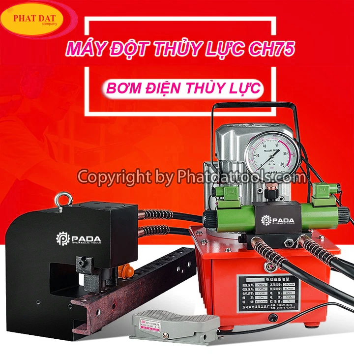 Máy Đột Thủy Lực CH75A có thể dung kết hợp với Bơm tay thủy lực hoặc Bơm điện thủy lực. Nhưng để hoạt động tốt nhất nên dùng bơm điện thủy lực DYB63A hoặc HHB700A