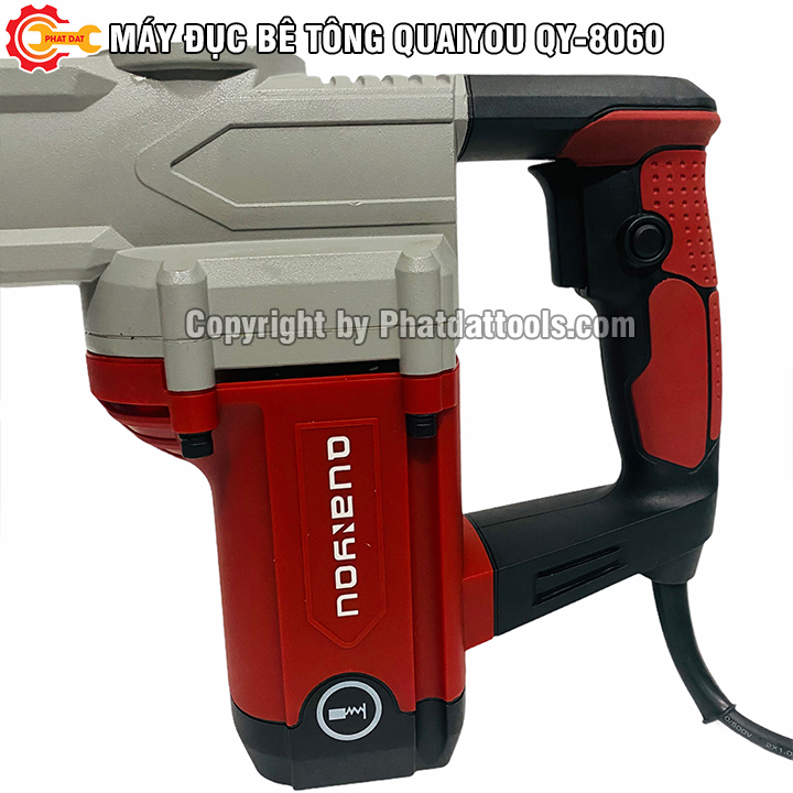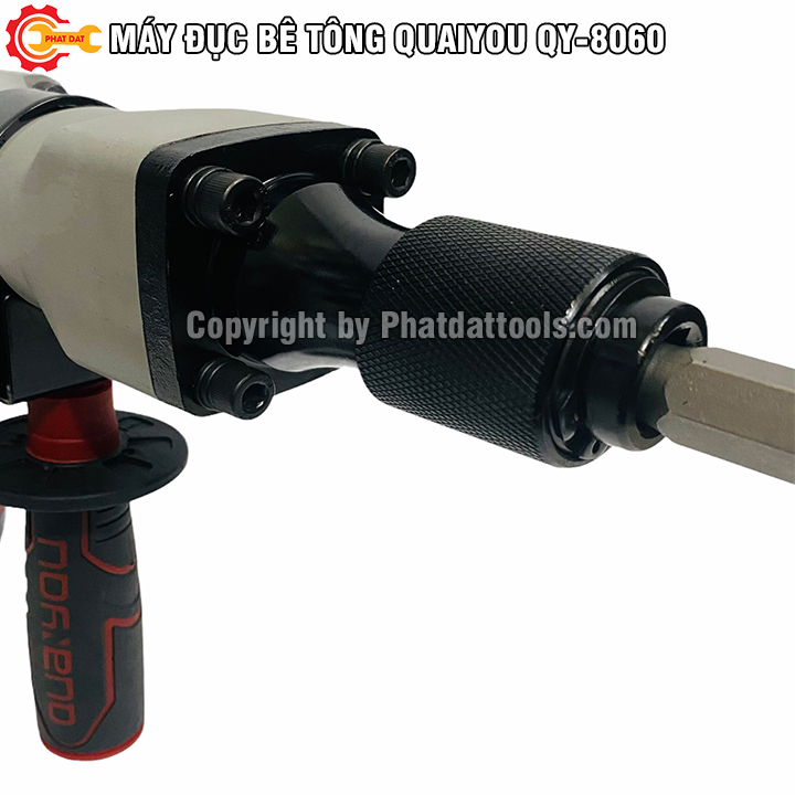 Máy đục bê tông QUANYOU QY-8060 có thêm tay nắm phụ giúp bạn cố định,giữ thăng bằng và chắc chắn khi đang thao tác,lỗ gắn mũi đục ó kích thước tiêu chuẩn,phù hợp với những mũi đục thông dụng trên thị trường giúp bạn dễ dàng tháo lắp,thay thế.