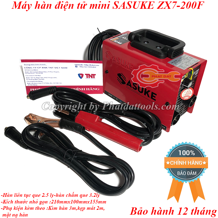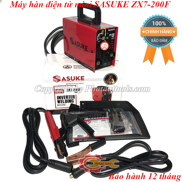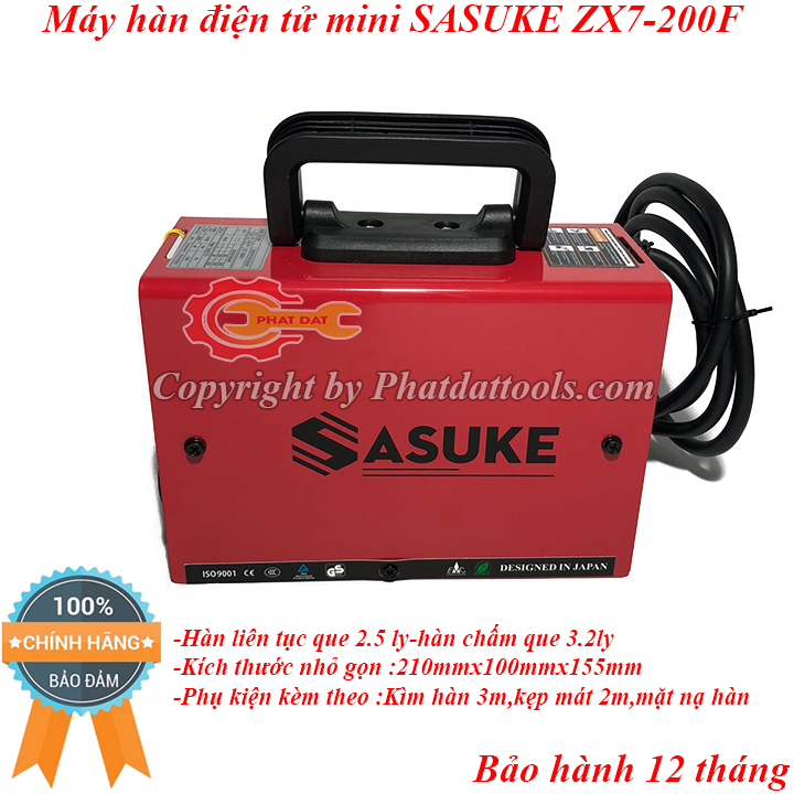 Máy hàn điện tử mini SASUKE ZX7-200F có khả năng hàn que 1.6-3.2 ly,hàn liên tục với que 2.5ly,hàn chấm điểm với que 3.2ly.Vỏ máy có kết cấu chắc chắn,có dây đeo thuận tiện di chuyển,logo SASUKE dập nổi chống hàng giả.