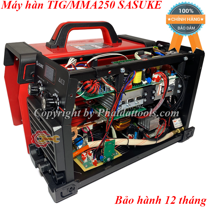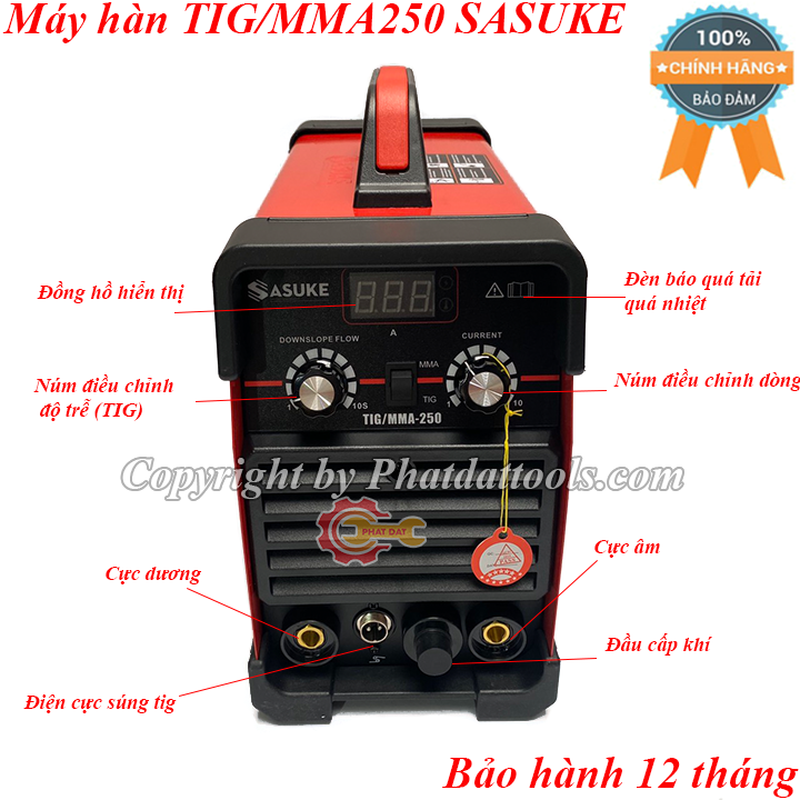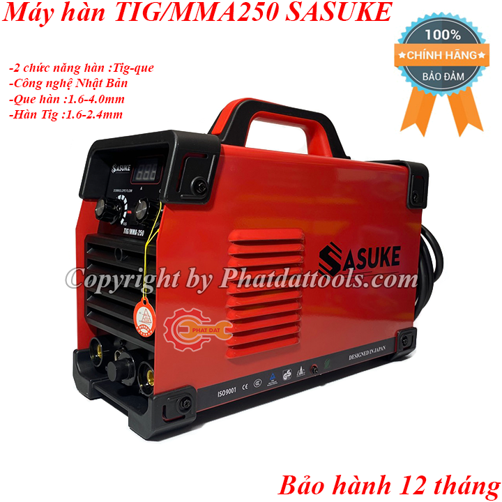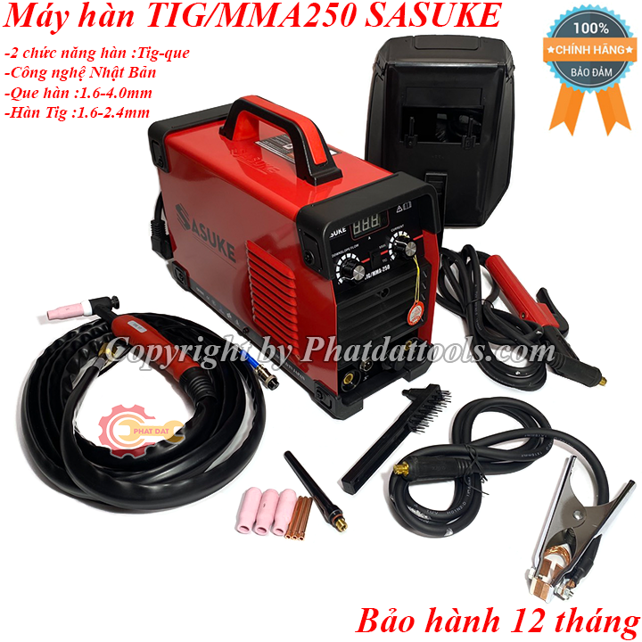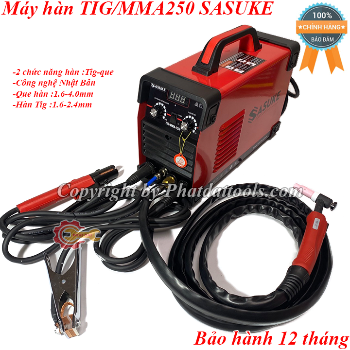 Máy hàn điện tử TIG/MMA-250A SASUKE 2 chức năng sử dụng công nghệ biến tần IGBT inverter đóng ngắt xung hàn bằng Sò bán dẫn IGPT tần số cao, ngắt tải ngay khi không dùng.Máy có màn hình hiển thị dòng hàn,núm điều chỉnh dòng hàn,điều chỉnh độ trễ,đèn báo quá tải,quá nhiệt,công tắc chuyển đổi chế độ hàn TIG-MMA.