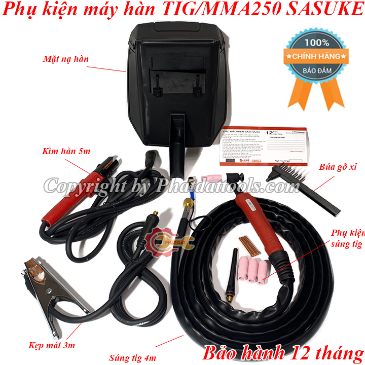 Phụ kiện đi kèm :Mỏ hàn tig 4m,kìm hàn 5m,kẹp mát 3m,phụ kiện kẹp kìm,chụp sứ...