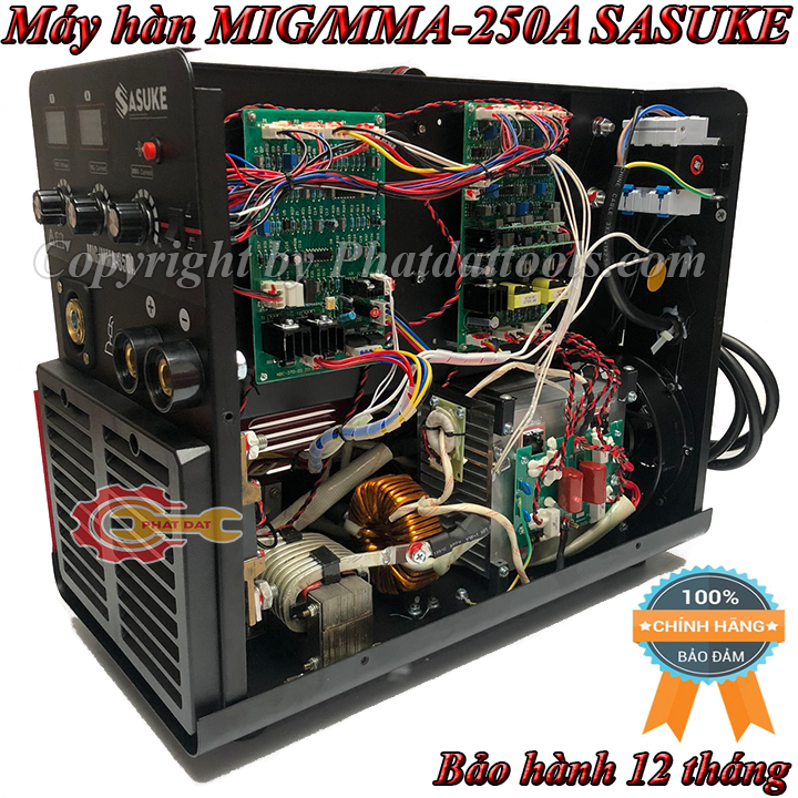 Máy hàn MIG/MMA-250A SASUKE với cấu tạo 4 tụ lớn,3 bo mạch: Nguồn - Điều Khiển - Công suất 12 sò,giúp máy hoạt động tốt với tần suất lớn và tản nhiệt tốt đảm bảo linh kiện luôn ở nhiệt độ cho phép, hoạt động tốt trong thời gian sử dụng liên tục.
