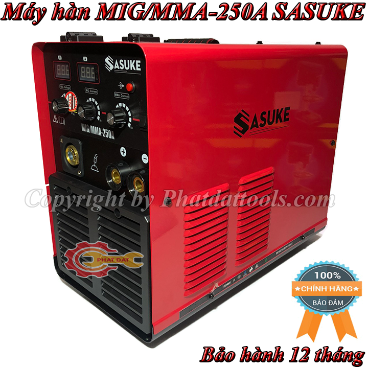Máy hàn MIG/MMA-250A SASUKE có màn hình hiển thị, núm điều chỉnh dòng hàn từ 20 - 250 A, Vỏ bọc ngoài của máy hàn được sơn phủ tĩnh điện, chống điện giật, chống bụi bẩn,đèn báo quá tải,quá nhiệt.