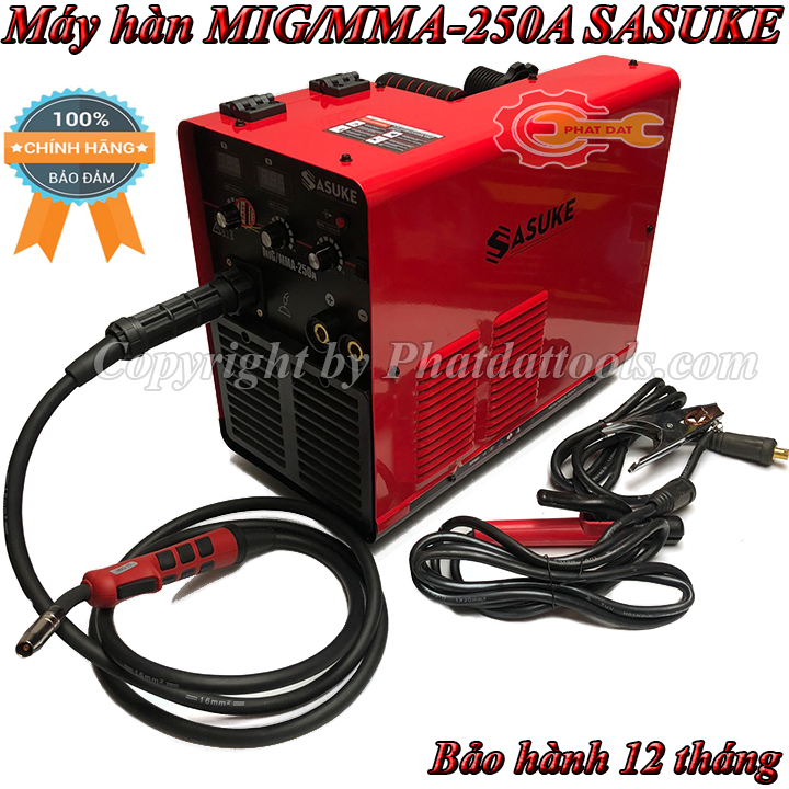 Máy hàn MIG/MMA-250A SASUKE là dòng máy hàn Mig cỡ lớn,với trọng lượng máy 26kg,dùng cuộn dây hàn 15kg,điện nguồn 220V,chuyên dụng cho các nhà xưởng lớn,hàn kết cấu vật liệu yêu cầu độ ngấu cao,cường độ làm việc lớn,mối hàn đẹp.