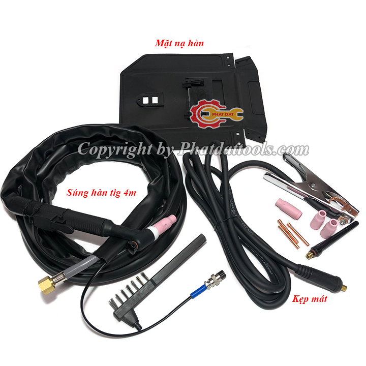 Phụ kiện đi kèm :Dây hàn tig 4m,kẹp mát 3m,chụp sứ x3,kẹp kim hàn x3,mặt nạ,búa gõ sỉ...