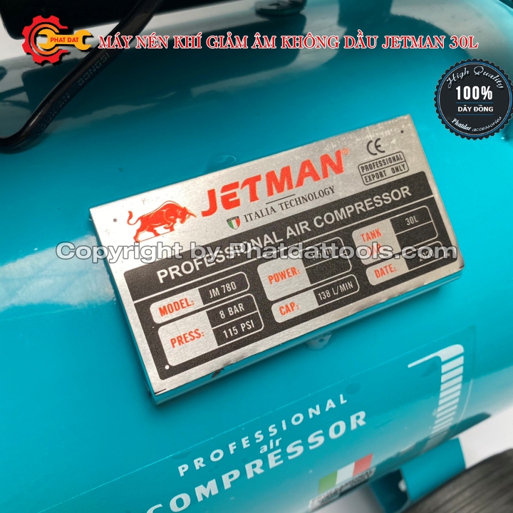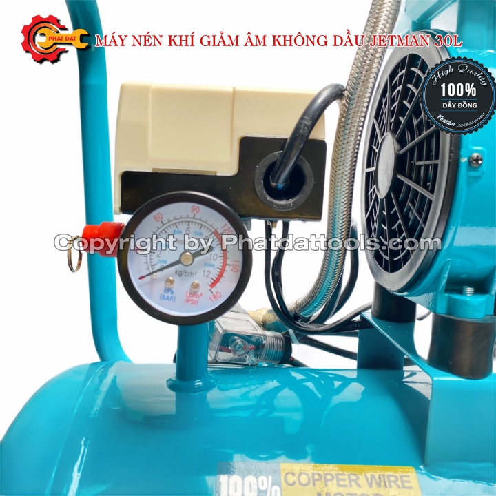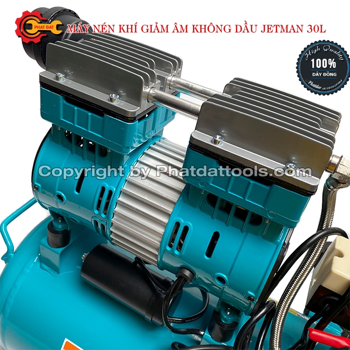 Máy nén khí giảm âm không dầu JETMAN 30L với motor động cơ 100% dây đồng chất lượng cao,2 tụ cho dòng điện vào máy ổn định,lớp cách điện 2 lớp an toàn.