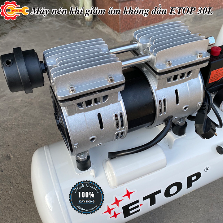 Máy nén khí sạch giảm âm không dầu ETOP 30L là loại máy nén khí có độ ồn thấp,hoàn toàn không sử dụng dầu,đảm bảo khí nén sạch 100%,phù hợp dùng trong các lĩnh vực y tế,thực phẩm,thi công xây dựng,chế tạo máy,sửa chữa ô tô,xe máy...