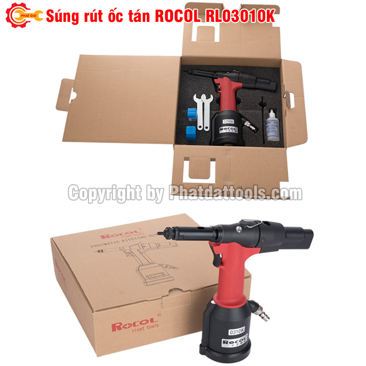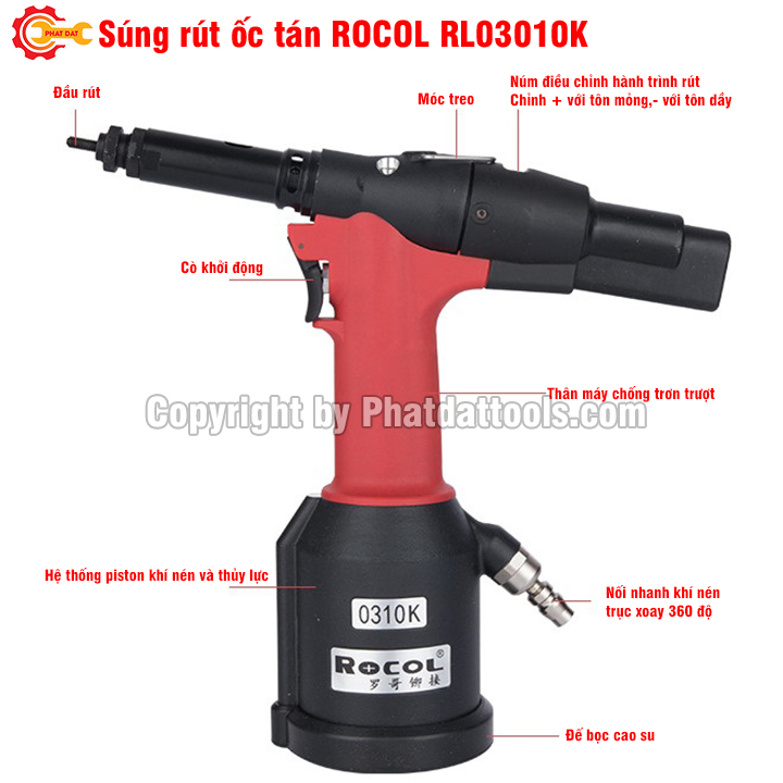 Máy rút ốc tán dùng hơi ROCOL R0310 với sức mạnh của thiết bị dùng khí nén kết hợp cơ cấu thủy lực giúp thao tác nhanh với 1-2s/1 lần rút,lực rút lên đến 19000KN,khả năng rút ốc từ M4-M5-M6-M8-M10 đều rất tốt,sử dụng ổn định trên cả ốc tán inox.Cấu tạo súng bằng thép nhiệt luyện dầy dặn cho độ bền,chịu áp,chịu va đập cực tốt.