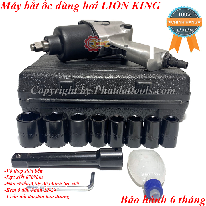 Máy siết ốc dùng hơi LION KING đi kèm 8 đầu khẩu:12-13-14-15-17-19-22-24mm thông dụng,kèm cần nối dài để siết bulong ở những vị trí sâu,hẹp rất tiện dụng.Máy cho lực siết cực khỏe lên đến 570N.m cùng chế độ đảo chiều 5 cấp giúp bạn dễ dàng siết mở những con ốc cứng đầu nhất,nâng cao năng suất lao động.