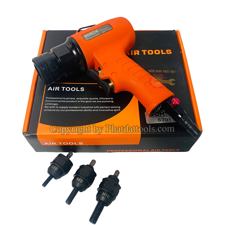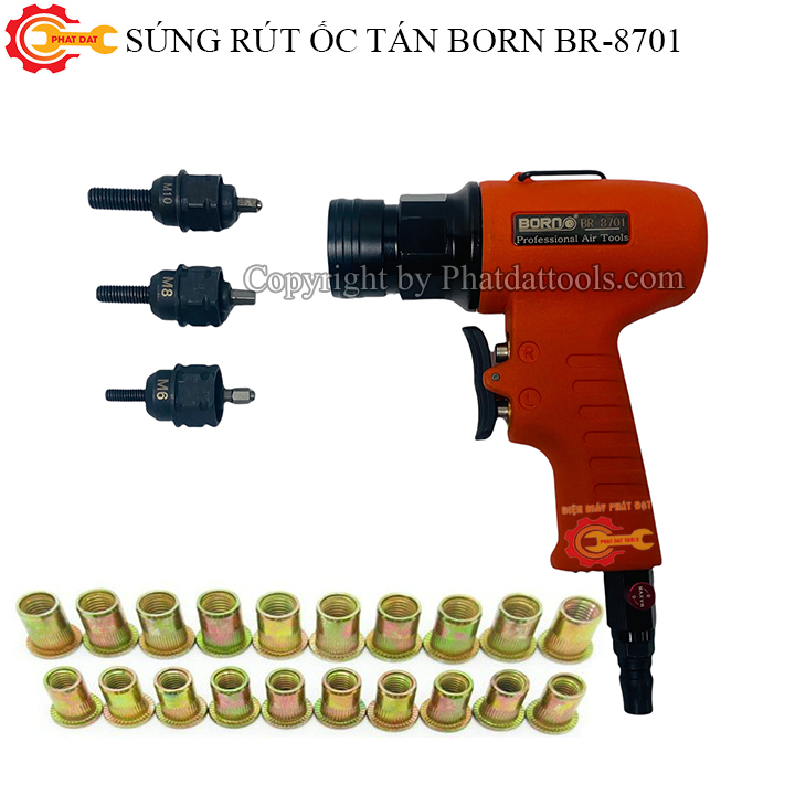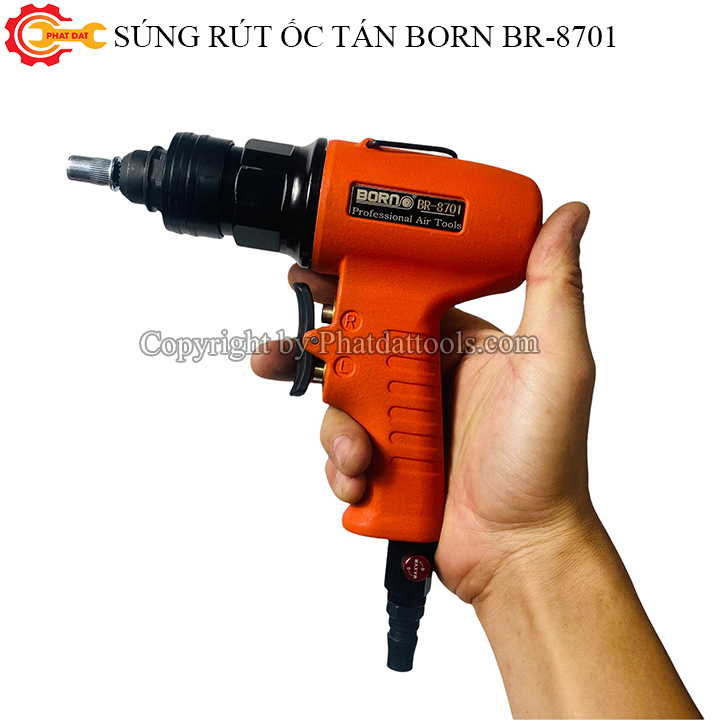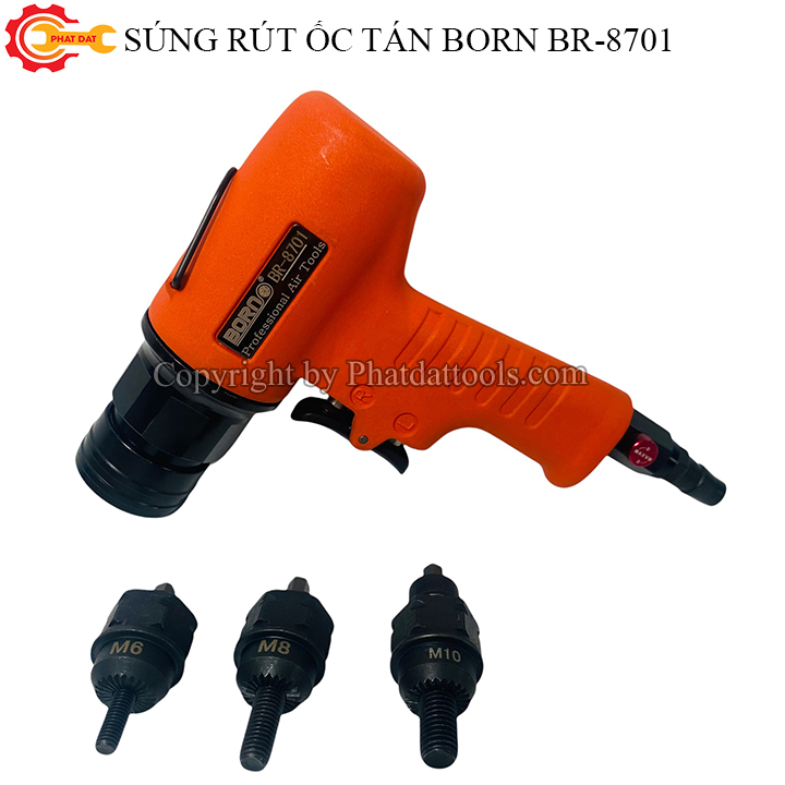 Súng Rút Ốc Tán BORN BR-8701 với sức mạnh của thiết bị dùng khí nén giúp thao tác nhanh với 1-2s/1 lần rút,khả năng rút ốc từ M6-M8-M10.Cấu tạo súng bằng thép nhiệt luyện dầy dặn cho độ bền,chịu áp,chịu va đập cực tốt.Thiết kế nhỏ gọn cầm tay,dễ dàng thao tác công việc.