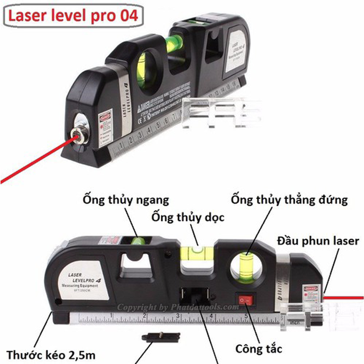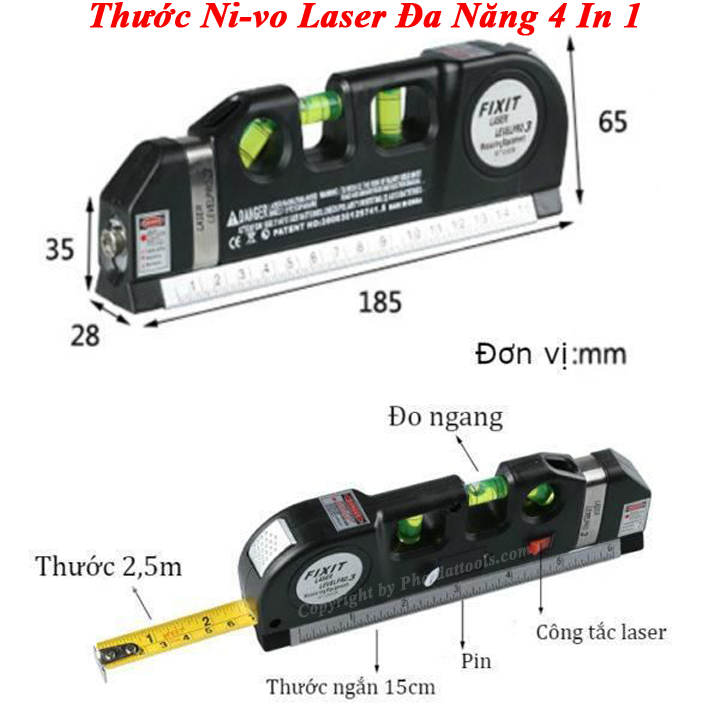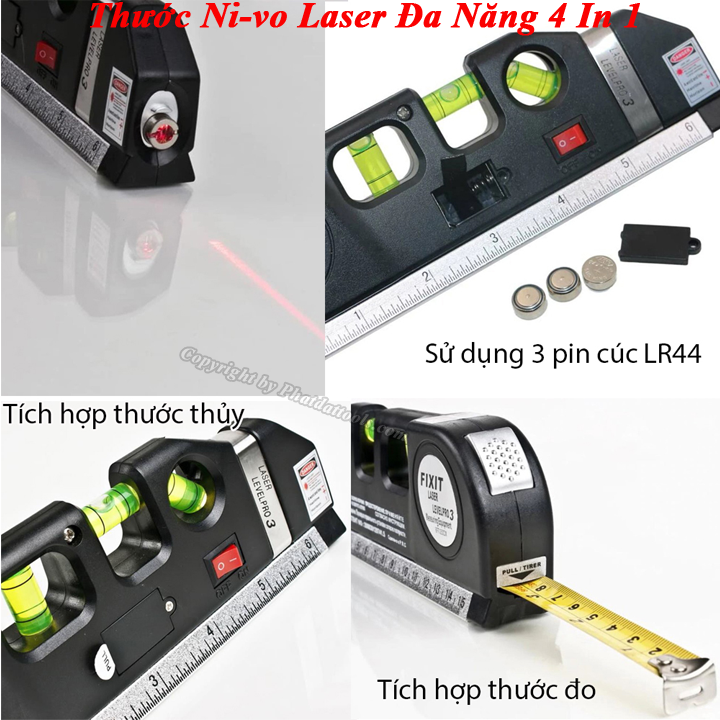 Cách sử dụng: + B1: Chỉnh phần đầu của Ni vô để xác định phương cần lấy thăng bằng là ngang hay dọc + B2: Bật công tắc sang "On" để có tia laser + B3: Căn chỉnh sao cho bọt thủy chuẩn ở giữa (tùy theo phương cần xác định thăng bằng ta sử dụng bọt thủy chuẩn khác nhau, trên Ni vô có 3 bọt thủy chuẩn để xác định phương ngang - dọc - nghiêng 45 độ)