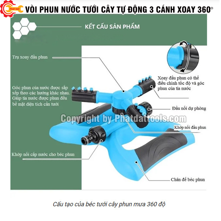 -Vòi phun xoay 360° với những lỗ nhỏ được thiết kế xung quanh đầu phun giúp tưới ra thành nhiều tia có thể xoay tròn 360°. Phun 3 tia với thiết kế 3 đầu phun và khả năng xoay tròn 360 giúp tưới nước ở diện tích xung quanh. Khoảng cách phun xa lên tới 8m - 10m ( tương đương 26ft-32.8ft với các ống tiêu chuẩn quốc tế.).