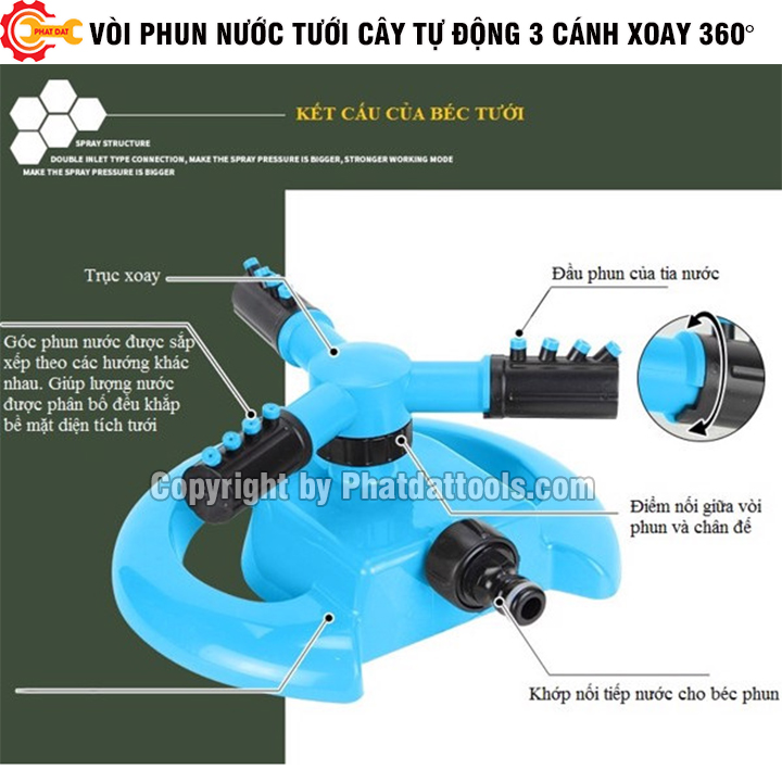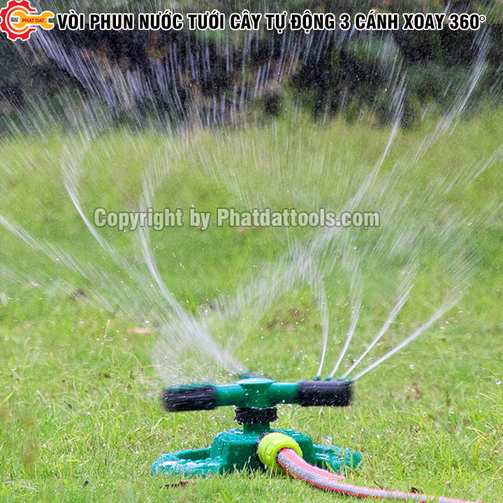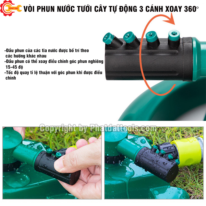 -Vòi phun xoay 360° với những lỗ nhỏ được thiết kế xung quanh đầu phun giúp tưới ra thành nhiều tia có thể xoay tròn 360°. Phun 3 tia với thiết kế 3 đầu phun và khả năng xoay tròn 360 giúp tưới nước ở diện tích xung quanh. Khoảng cách phun xa lên tới 8m - 10m ( tương đương 26ft-32.8ft với các ống tiêu chuẩn quốc tế.).